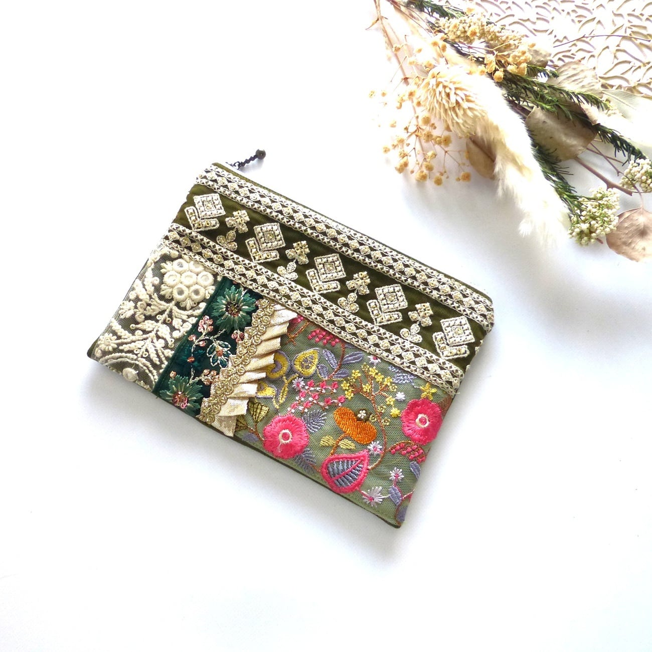 宝石箱みたいな刺繍リボンパッチワークぺたんこポーチ ◇khaki