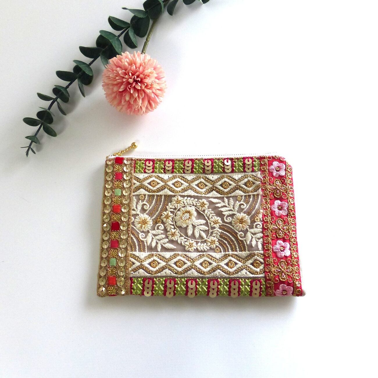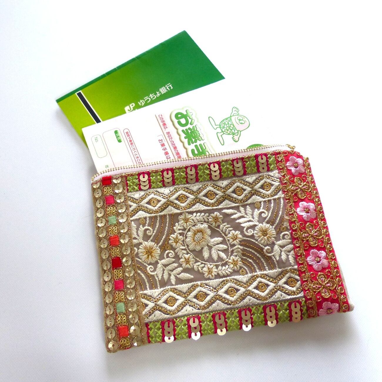 宝石みたいな刺繍リボンパッチワークぺたんこポーチ◇morocco